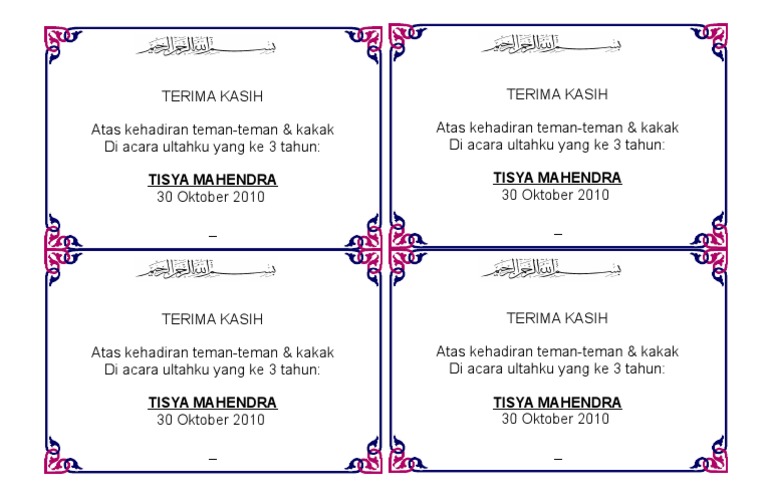 Berikut ini contoh ucapan aqiqah anak : Setiap kali kamu berkomunikasi dan meminta tolong kepada orang lain, sudah sepatutnya kamu menyampaikan terima kasih atas pertolongan tersebut. Ucapan terimakasih ini ditempel di tempat nasi biasanya dipakai saat selesai acara tasyakuran sebagai tanda ucapan terima kasih atas kehadiran kehadiran dan bantuan doa. Ucapan terimakasih ini ditempel di tempat nasi biasanya dipakai saat selesai acara tasyakuran sebagai tanda ucapan terima kasih atas kehadiran kehadiran dan bantuan do'a. Contoh kartu ucapan terima kasih aqiqah, kartu ucapan di souvenir ultah, kartu ucapan terima kasih atas kehadiran pernikahan, kartu ucapan terima kasih untuk orang tua dalam bahasa inggris, voucher pengambilan souvenir leave a. Mulailah dengan mengekspresikan rasa syukur. Ucapan khitanan di kotak nasi doc. 12 responses to download contoh kartu ucapan aqiqah cantik versi word pada berkat kotak nasi aqiqah malang nikmat catering 3 april 2018 at 13 46 terima kasih contoh kartu ucapan aqiqah nya sangat bagus bisa jadi inspirasi saat mau mengaqiqahi anak. Seperti yang kita pahami bersama, kartu ucapan terima kasih aqiqah merupakan suatu informasi yg diperlukan bagi sementara manusia. Berikut beberapa contoh ucapan tasyakuran aqiqah yang bisa dijadikan referensi. Untuk menyampaikan ucapan bahagia dan terima kasih kepada para pengunjung atau tamu undangan dalam aqiqah, biasanya setiap orang butuh contoh kartu ucapan aqiqah anak pada nasi kotak aqiqah. Sedikit penjelasan mengapa anda memberi pidato ini adalah awal yang alami untuk memulai pidato. Buat desain yang sederhana namun sepenuh hati.