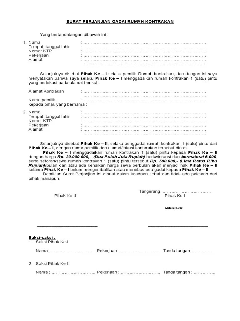 Berikut adalah detail contoh surat perjanjian gadai rumah sederhana. Contoh surat perjanjian gadai rumah dengan 12 pasal. Pada hari ini selasa tanggal dua puluh satu bulan januari tahun dua ribu ……., telah diadakan perjanjian gadai yang . Apabila pihak kedua memperpanjang masa gadai rumah karena pihak kedua belum dapat melunasi pinjaman kepada pihak pertama, maka pihak kedua berhak untuk. Contoh surat perjanjian gadai mobil masih kredit yang sah aneka.